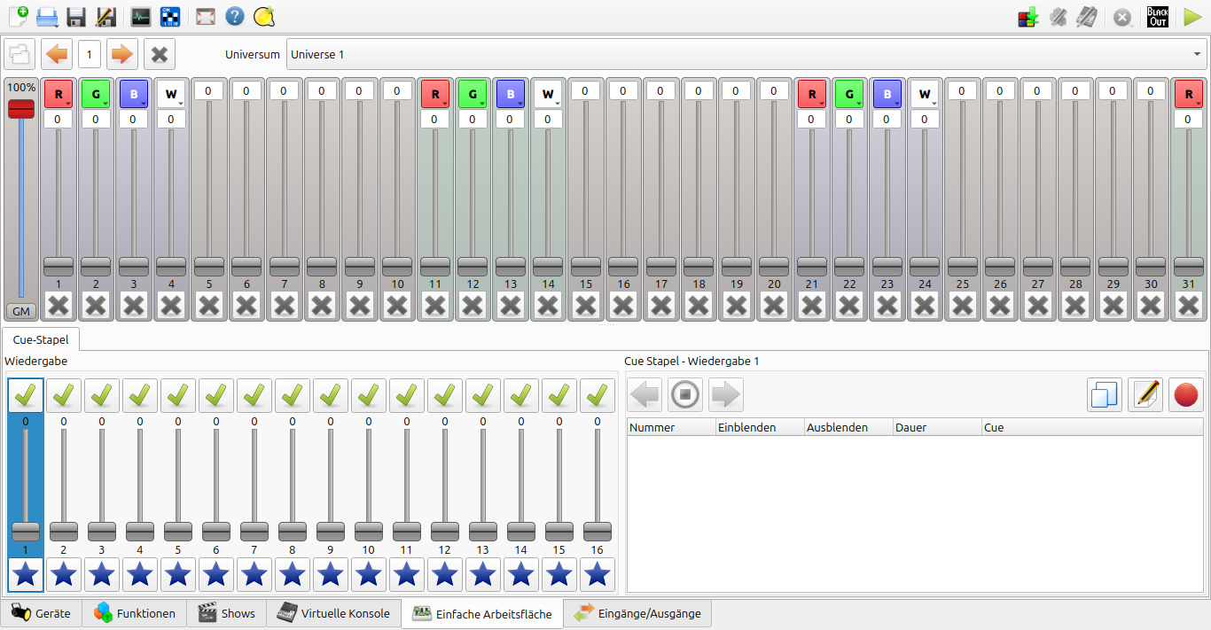 Einfache Arbeitsfläche: Beim Betrieb als Generic RGBW müssen die Geräte in den 4-Kanalmodus geschaltet werden (typische Display-Modus-Bezeichnung ist hier PErS); bei 4 Geräten bietet es sich an, die Startadressen auf 1, 11, 21 und 31 einzustellen (typische Display-Modus-Bezeichnung ist hier Addr). Zur Übernahme der neuen Werte scheint bei manchen Geräten ein Aus- und Wieder-Einschalten notwendig zu sein. Zum Steuern der Leuchten findet sich unter dem Reiter Einfache Arbeitsfläche eine übersichtliche Darstellung. Der Modus Einfache Arbeitsfläche passt gut für einfache Anwendungssituationen und wird hier für den Einstieg in DMX/QLC+ unbedingt empfohlen.2)