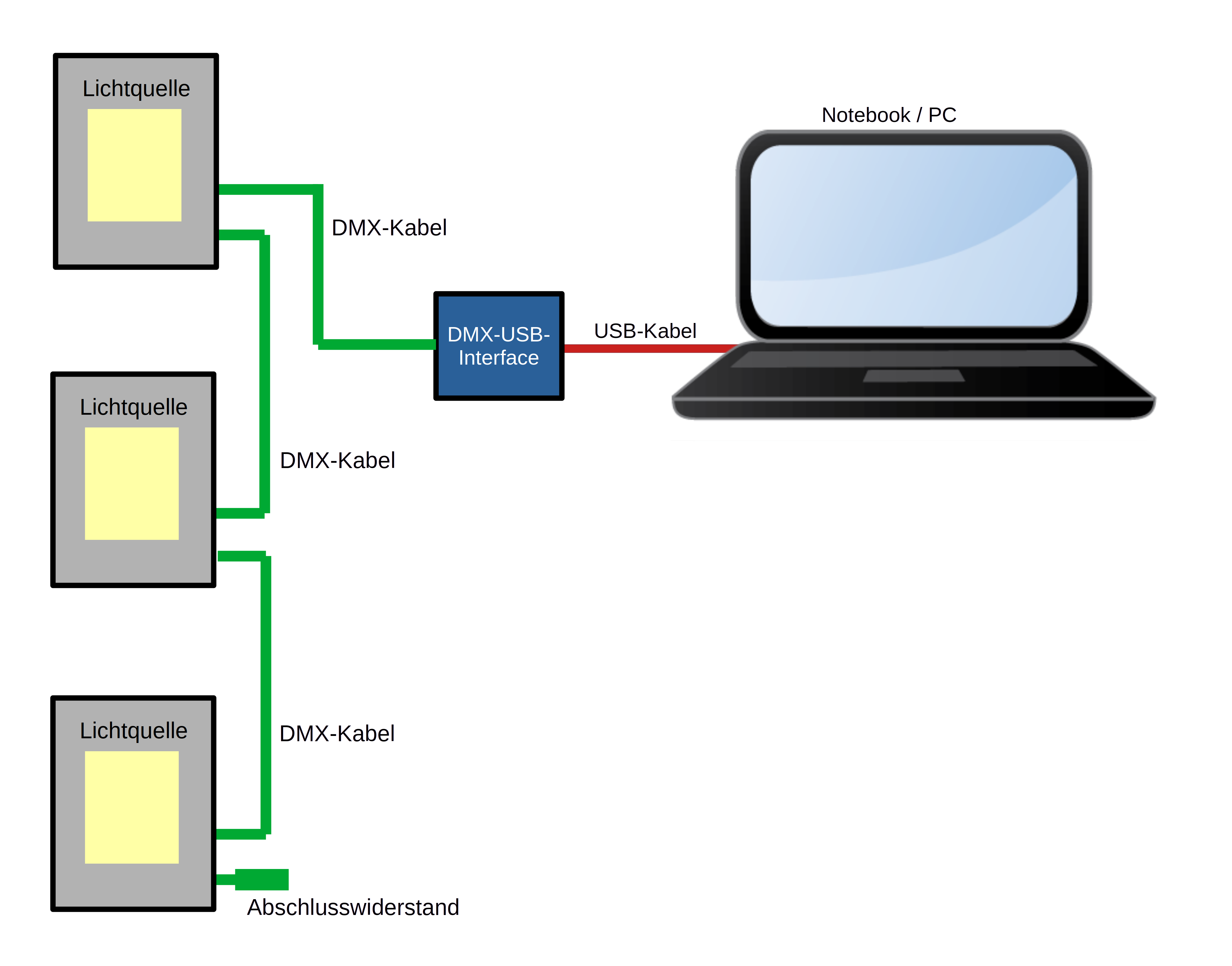 Neben dem Computer und den Lichtquellen werden ein DMX-USB-Interface, spezielle DMX-Kabel und ein DMX-Abschlusswiderstand benötigt. DMX-Kabel gibt es in 5-adriger und in 3-adriger Ausführung; für professionellere LED-Scheinwerfer werden meist 5-adrige Kabel benötigt. Die DMX-Kabel sehen professionellen Mikrofon-Kabeln täuschend ähnlich; sie haben insbesondere auch die gleichen Stecker, aber völlig andere elektrische Kennwerte. Die Scheinwerfer hängen in einer Reihe (s. Skizze auf S. 2) am Controller; deshalb wird pro Lichtquelle ein Kabel und für die letzte Lichtquelle zusätzlich ein Abschlusswiderstand benötigt.